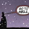 Description: A figure turning away with a speech bubble 'go to hell'. (Steph Brown as Spoiler)